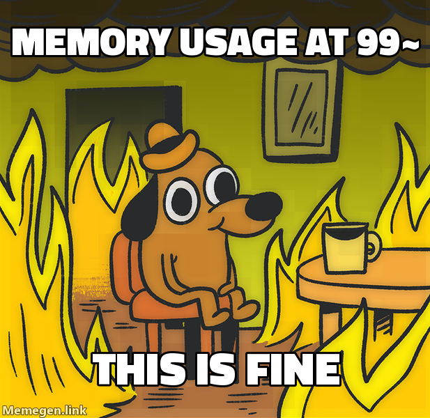Template: fine https://api.memegen.link/images/fine/memory_usage_at_99~/this_is_fine.png